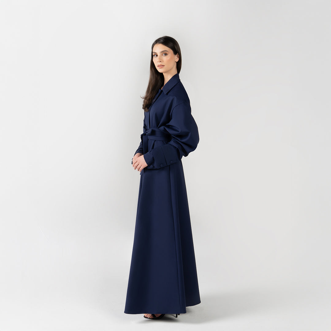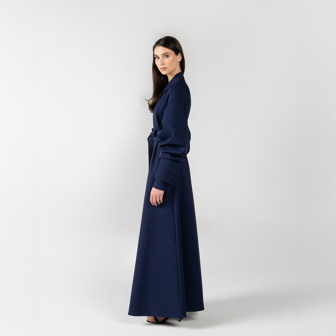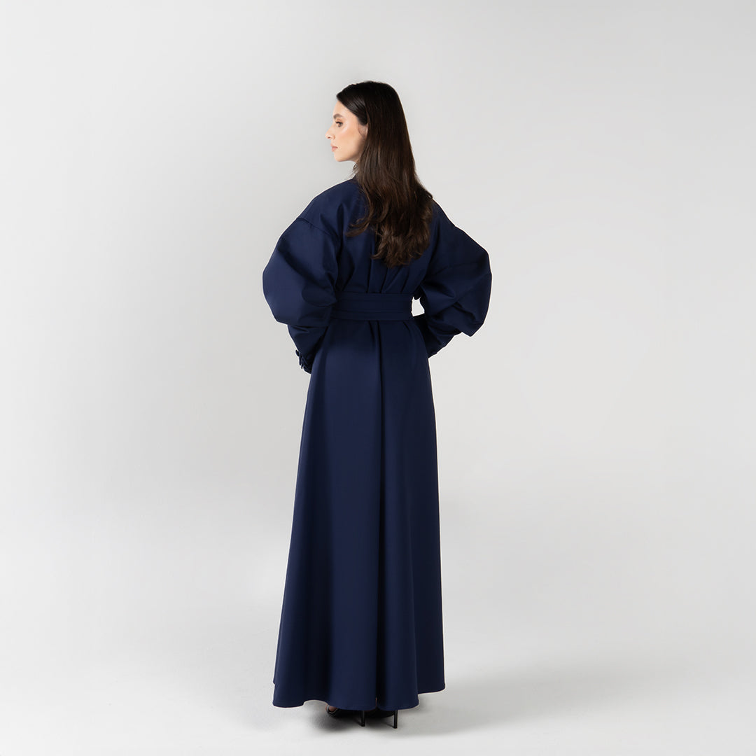 Elevate your wardrobe with the Celeste Dress — a beautifully constructed, navy-blue dress designed for modern elegance and functionality. Crafted from a premium cotton-polyester blend, this ankle-length dress features voluminous sleeves, and a detachable waist belt for definition. A hidden front button placket runs from neckline to hem, offering both a seamless look and practical ease — making Celeste ideal for modest fashion needs, and adjustable styling.