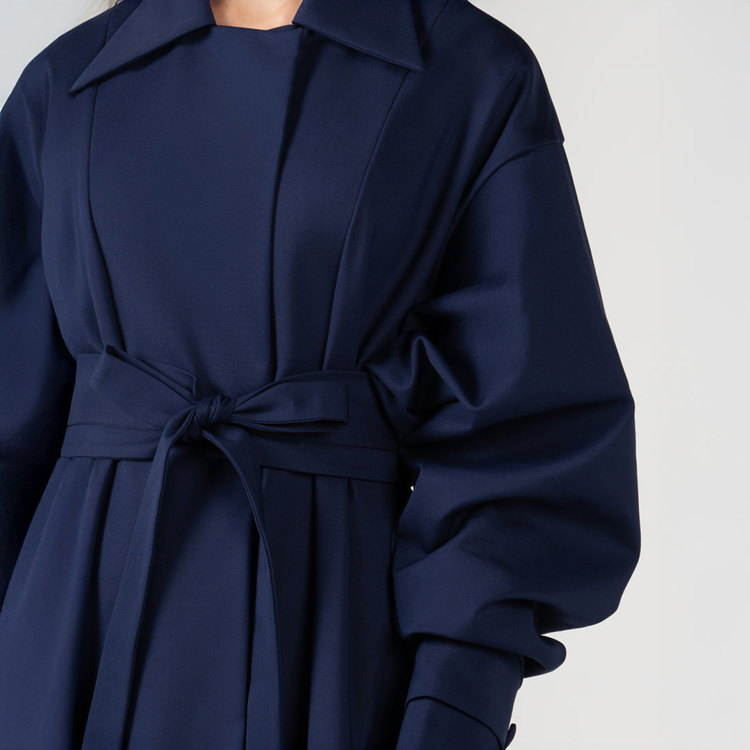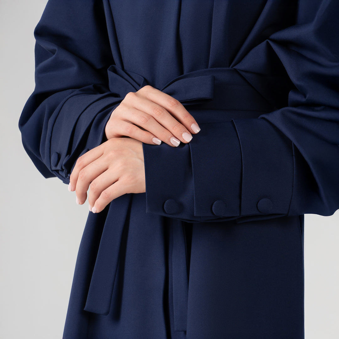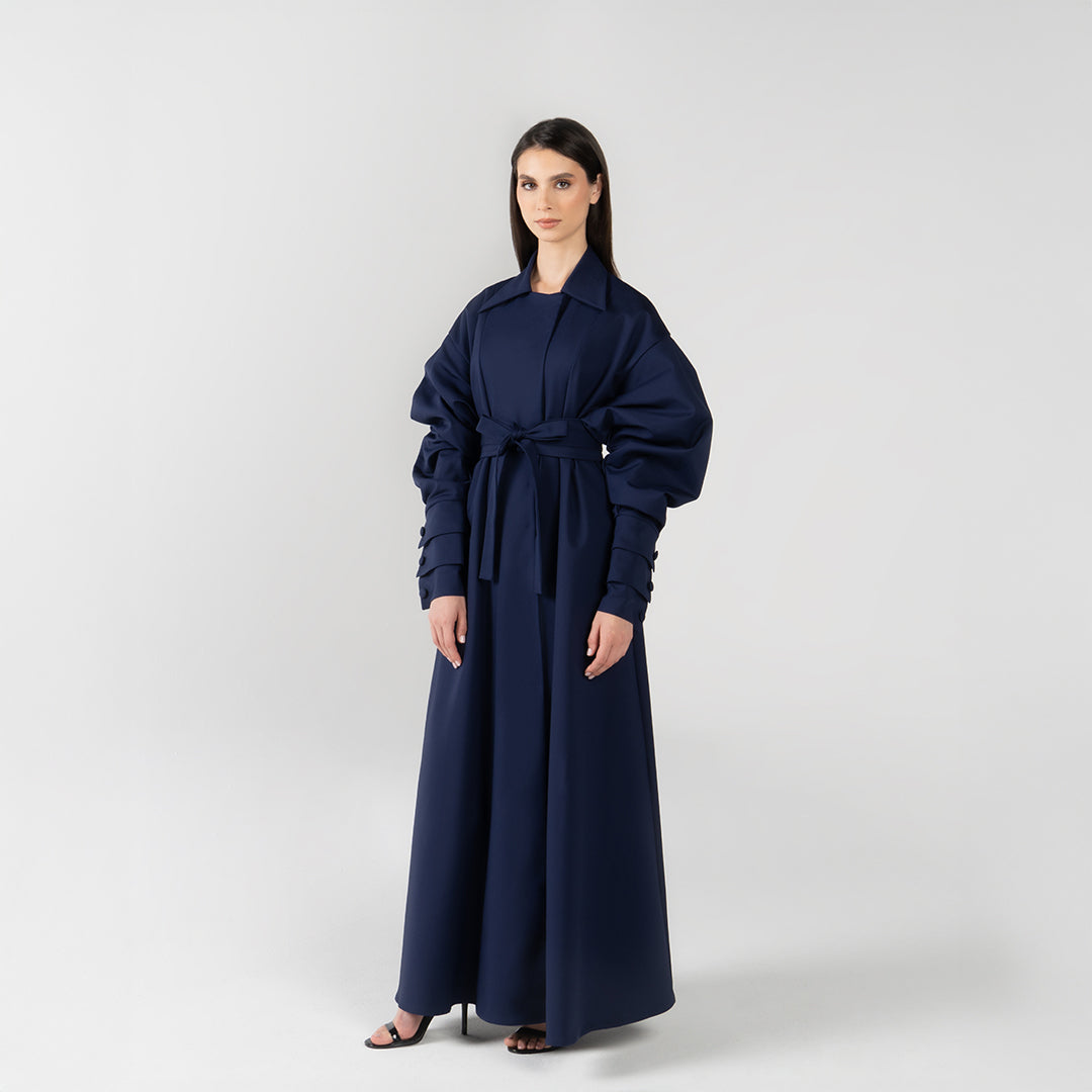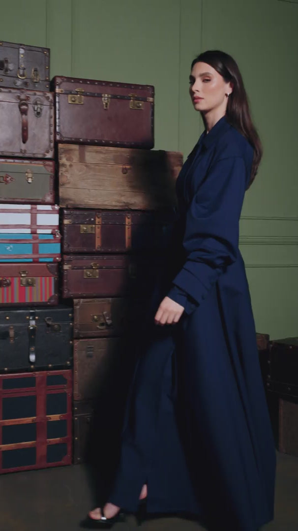 Elevate your wardrobe with the Celeste Dress — a beautifully constructed, navy-blue dress designed for modern elegance and functionality. Crafted from a premium cotton-polyester blend, this ankle-length dress features voluminous sleeves, and a detachable waist belt for definition. A hidden front button placket runs from neckline to hem, offering both a seamless look and practical ease — making Celeste ideal for modest fashion needs, and adjustable styling.